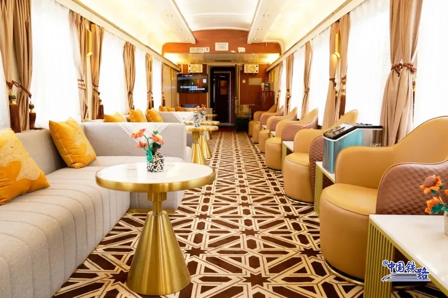 Photo shows the interior of the gold diamond class carriage of New Orient Express, a tourist-dedicated train that offers high-quality train travel around northwest China's Xinjiang Uygur Autonomous Region. (Photo/China Railway)