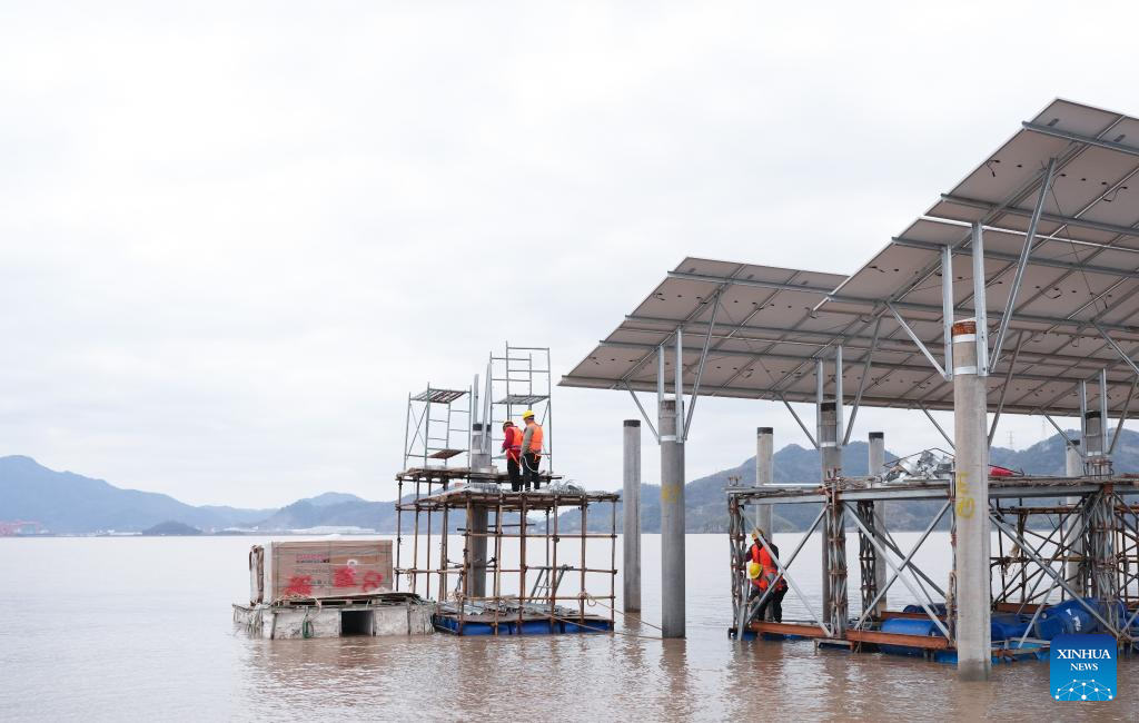 Staff members install photovoltaic panels in a tidal area in Sanmen County of Taizhou City, east China's Zhejiang Province, March 26, 2024. The photovoltaic power project in Sanmen County has generated over 20 million kWh of electricity. The project had a planned area of about 494 acres in size and was officially integrated into the electrical grid on Nov. 30, 2023. Following full integration into the grid, it is expected to produce up to 80 million kWh of electricity annually. (Xinhua/Weng Xinyang)