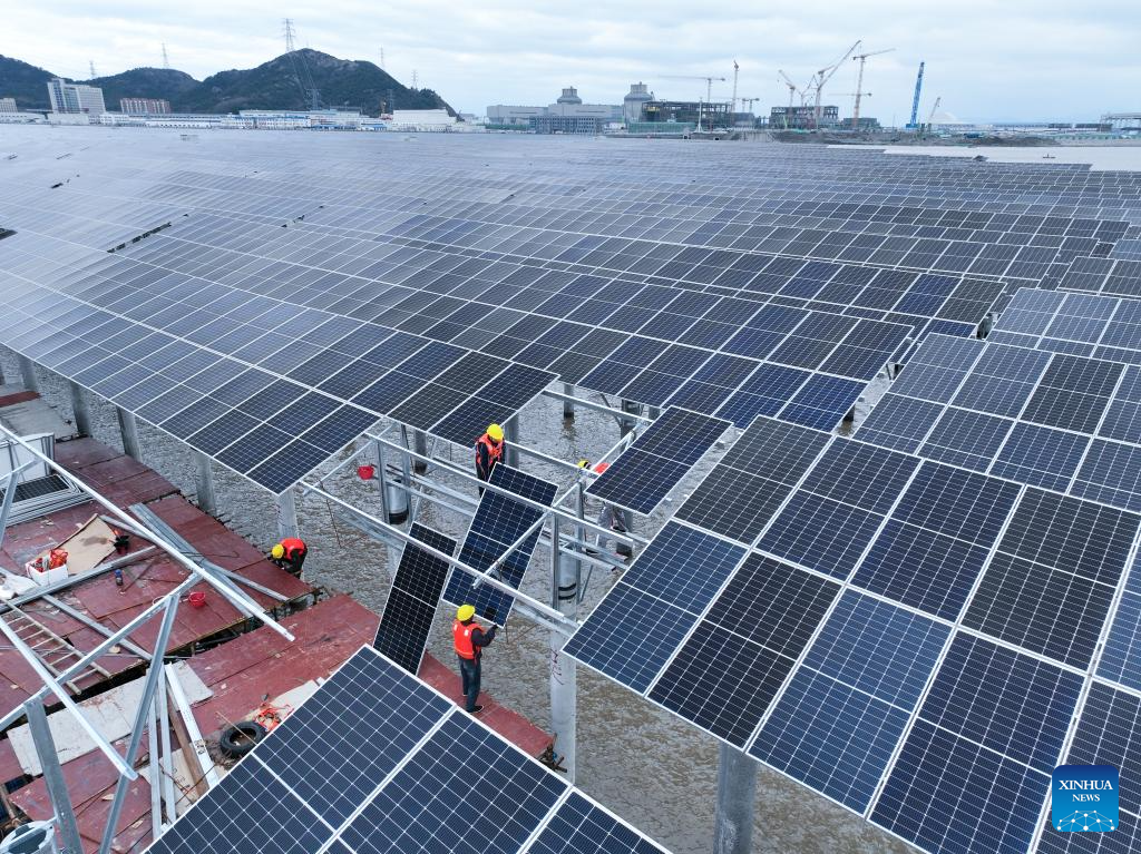 An aerial drone photo taken on March 26, 2024 shows staff members installing photovoltaic panels in the tidal area in Sanmen County of Taizhou City, east China's Zhejiang Province. The photovoltaic power project in Sanmen County has generated over 20 million kWh of electricity. The project had a planned area of about 494 acres in size and was officially integrated into the electrical grid on Nov. 30, 2023. Following full integration into the grid, it is expected to produce up to 80 million kWh of electricity annually. (Xinhua/Weng Xinyang)