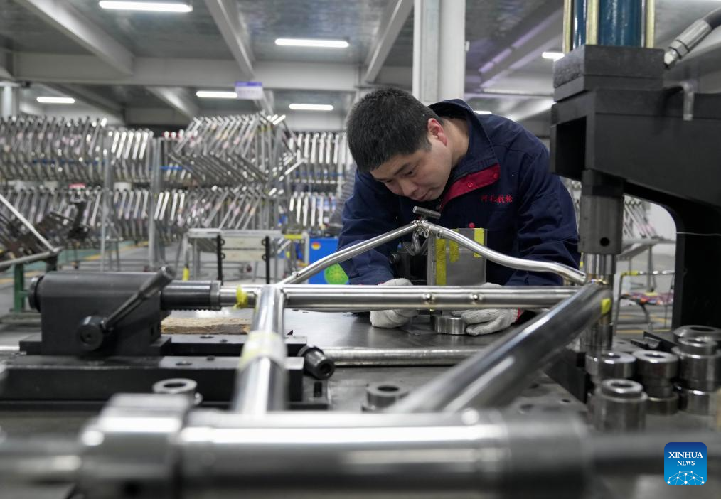 A man works at a workshop of a bike enterprise in Changli County, north China's Hebei Province, April 2, 2024. To advance high-quality economic development, local authorities of Changli has guided enterprises to focus on core technologies and improve innovation ability. (Xinhua/Yang Shiyao)