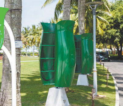 Flower-shaped wind turbines are installed at the plaza of the Boao Forum for Asia International Convention Center in the demonstration zone. They only need a wind speed of 1.2 meters per second to operate, the lowest starting speed requirement in the world so far, and can achieve 24-hour continuous power generation, said Liu Lianwei, deputy director of Hainan Province's department of housing and urban-rural development.