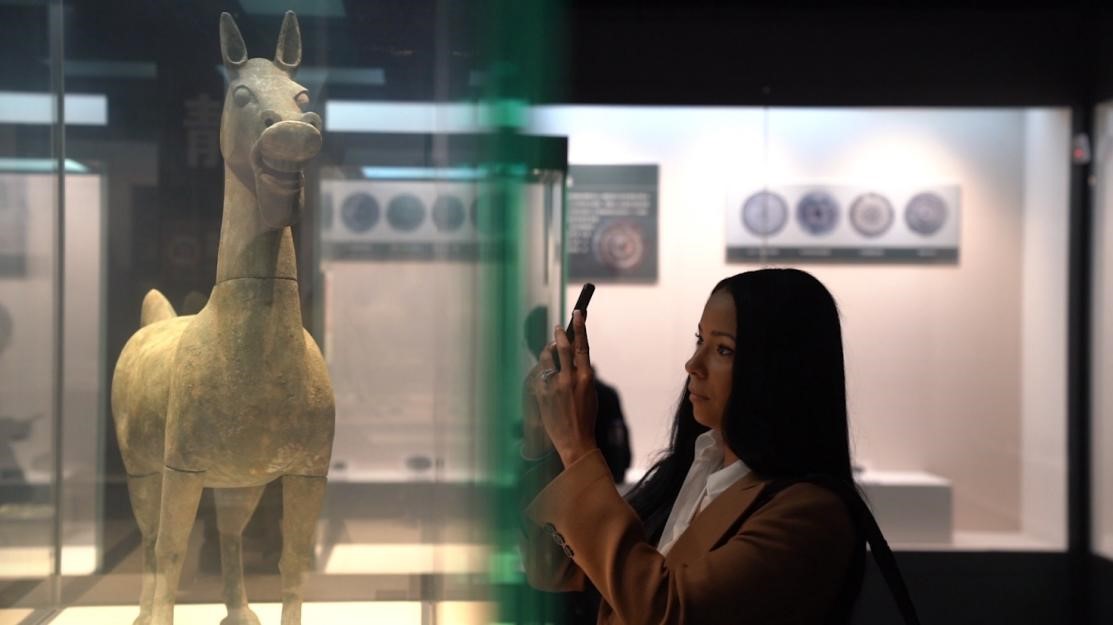 An international journalist takes pictures of a cultural relic at the Hepu Han Dynasty Cultural Museum in Beihai, south China's Guangxi Zhuang Autonomous Region, March 12, 2024. (People's Daily Online/Yuan Meng)