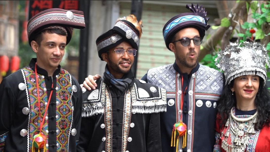 International journalists, dressed in the traditional attire of the Miao ethnic group, pose for a picture in the Miao village of Mengwu in Rongshui Miao Autonomous County, Liuzhou city, south China's Guangxi Zhuang Autonomous Region, March 14, 2024. (People's Daily Online/Zhou Linjia)