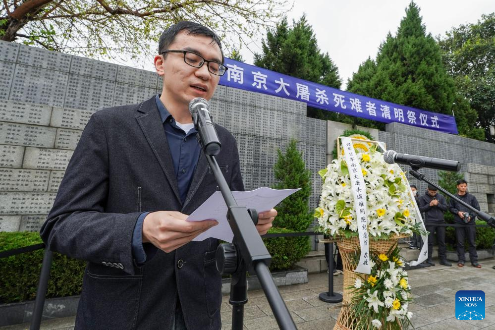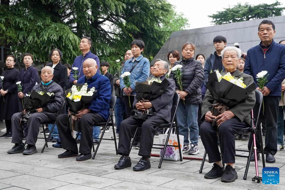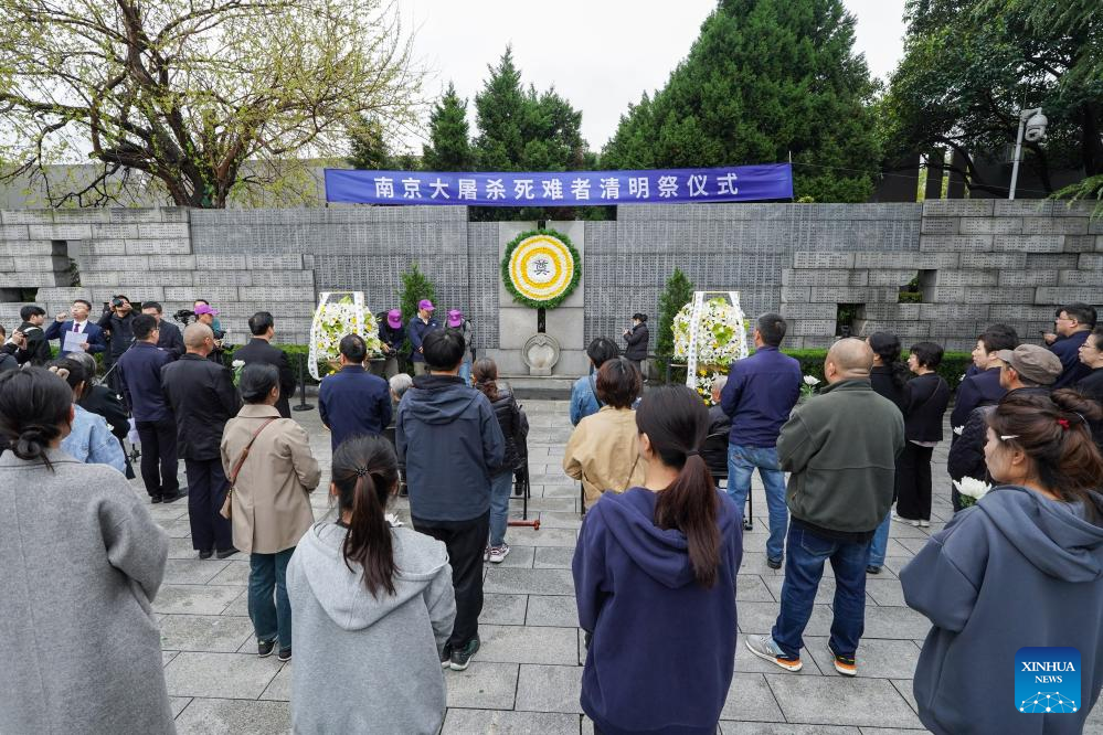 NANJING, April 3 (Xinhua) -- Relatives of victims of the Nanjing Massacre, as well as survivors, the descendants of survivors and student representatives, on Wednesday gathered at the Memorial Hall of the Victims in Nanjing Massacre by Japanese Invaders to pay tribute to those who lost their lives 87 years ago.