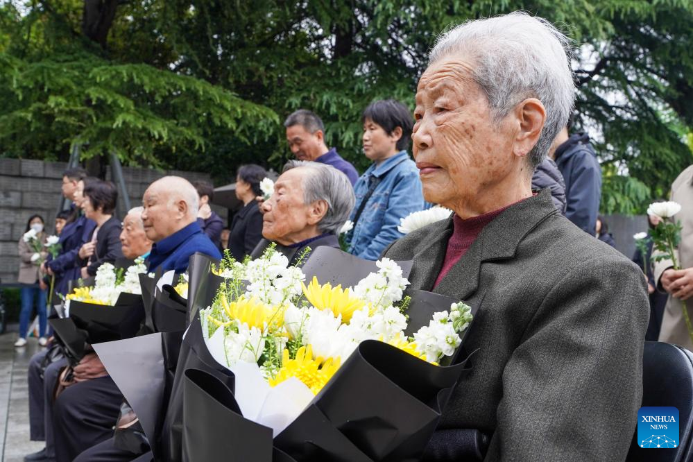 Nanjing Massacre survivors Ai Yiying, Xia Shuqin, Liu Minsheng, Chen Deshou (from R to L, front) attend a memorial ceremony at the Memorial Hall of the Victims in Nanjing Massacre by Japanese Invaders, in Nanjing, east China's Jiangsu Province, April 3, 2024.