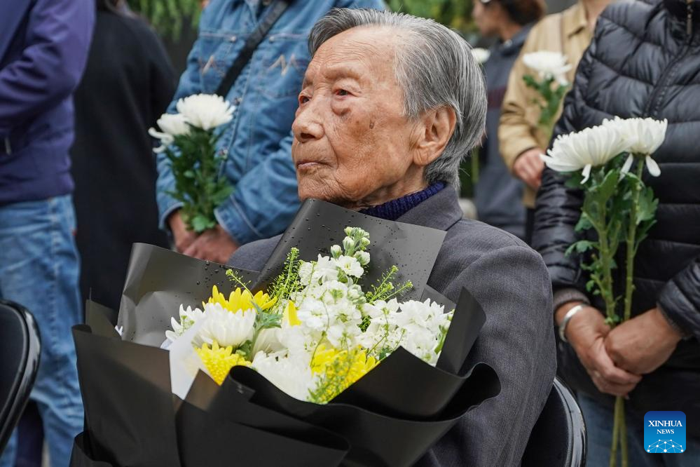 Xia Shuqin, a survivor of the Nanjing Massacre, attends a memorial ceremony at the Memorial Hall of the Victims in Nanjing Massacre by Japanese Invaders, in Nanjing, east China's Jiangsu Province, April 3, 2024.