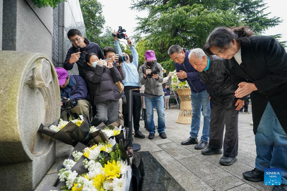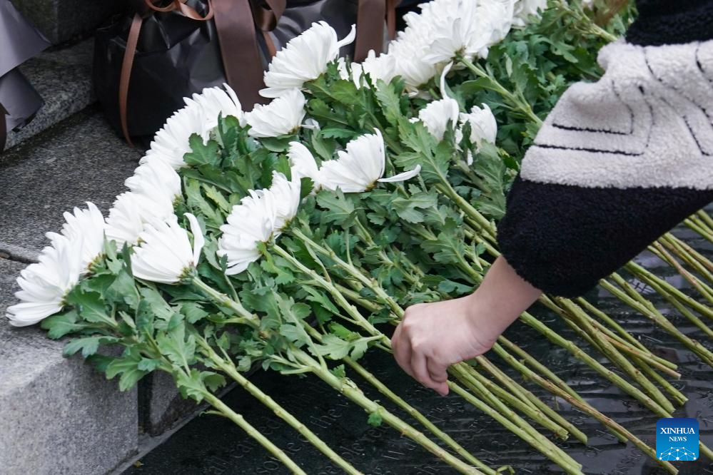 People lay flowers to victims of the Nanjing Massacre at the Memorial Hall of the Victims in Nanjing Massacre by Japanese Invaders, in Nanjing, east China's Jiangsu Province, April 3, 2024. (Xinhua/Li Bo)