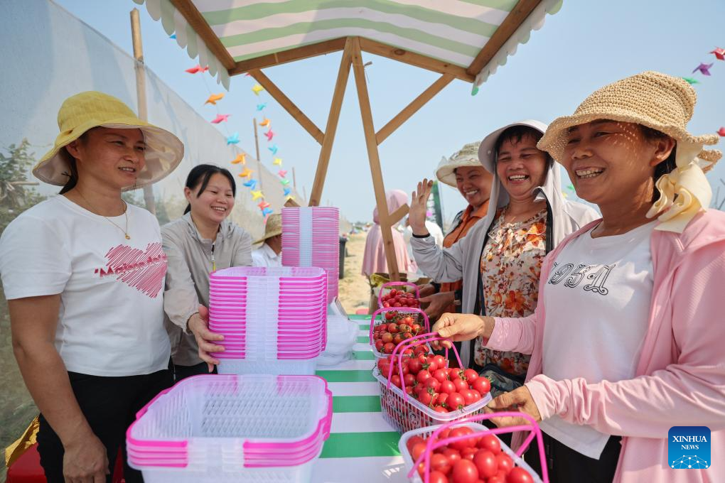 Tourists take part in a cherry tomato picking activity in Tanli Village of Dingan County, south China's Hainan Province, April 3, 2024. Dingan County held a cherry tomato picking festival on Wednesday. Various activities were carried out to promote the cherry tomato planting industry and local tourism. (Xinhua/Zhang Liyun)