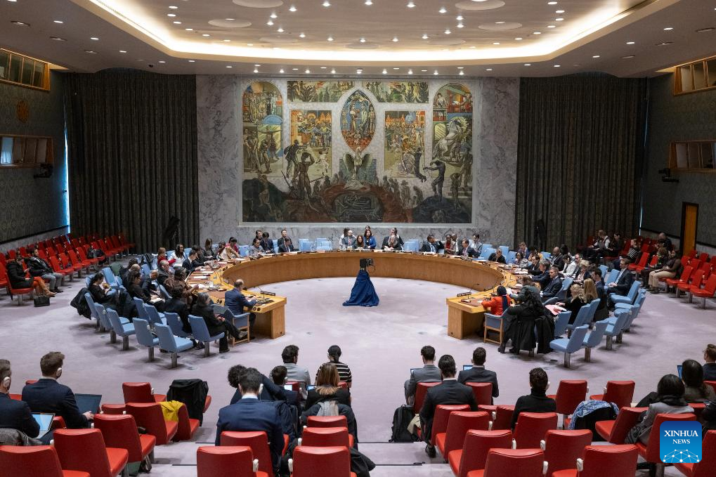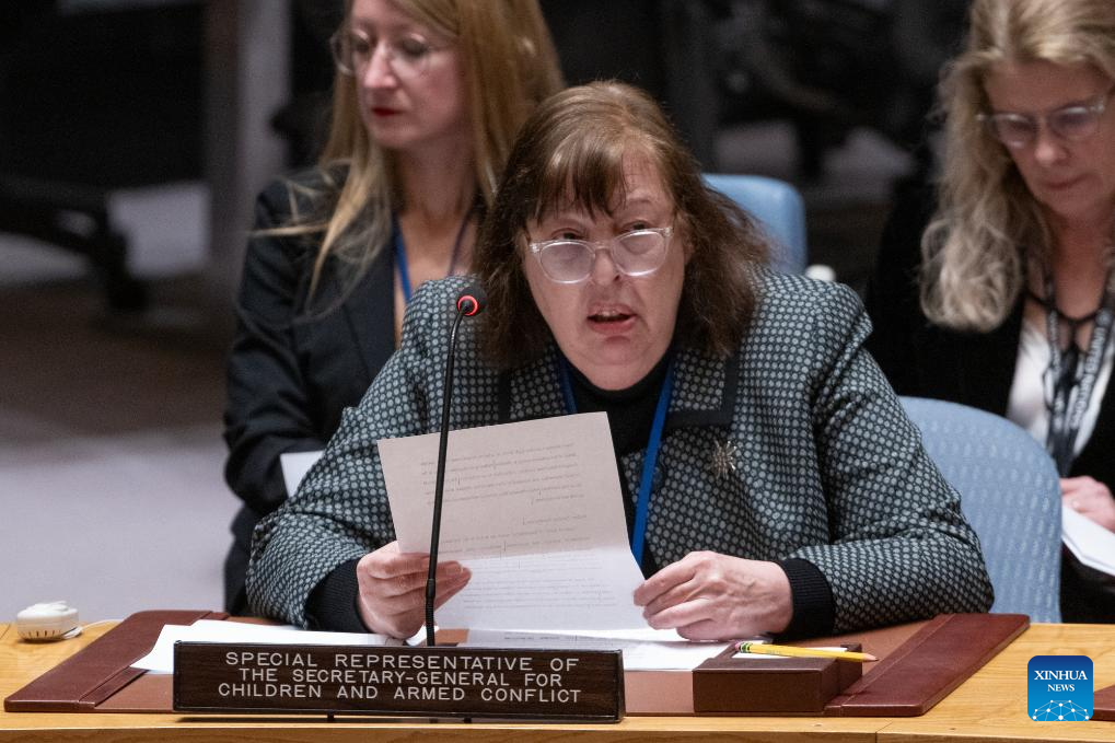 A UN Security Council meeting on children and armed conflict is held at the UN headquarters in New York, on April 3, 2024. The United Nations raised alarms Wednesday over the alarming global uptick in incidents where humanitarian aid for children is being obstructed, warning of dire consequences for the most vulnerable. (Eskinder Debebe/UN Photo/Handout via Xinhua)
