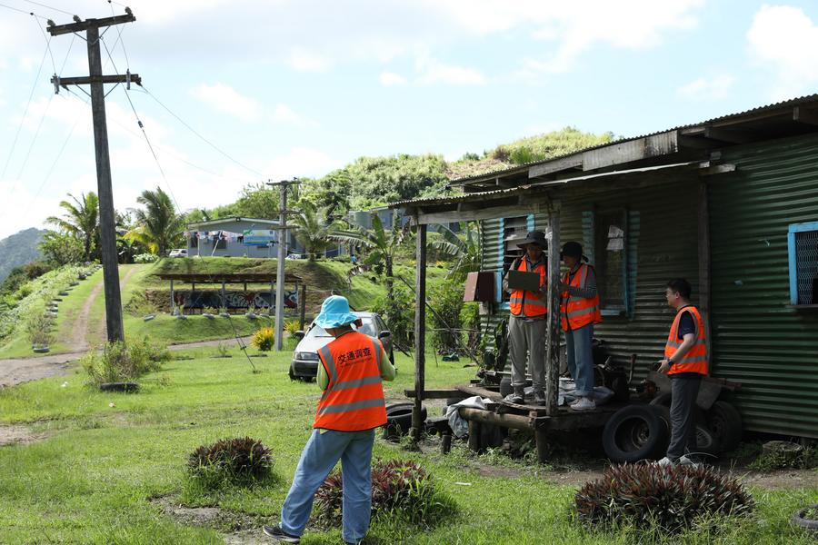 Staff members from China inspect the road upgrade project in Vanua Levu, Fiji, April 2, 2024. China's assistance is instrumental in the development of Fiji and other Pacific island countries, said Fijian Prime Minister Sitiveni Rabuka. (Photo by Sang Qinlong/Xinhua)