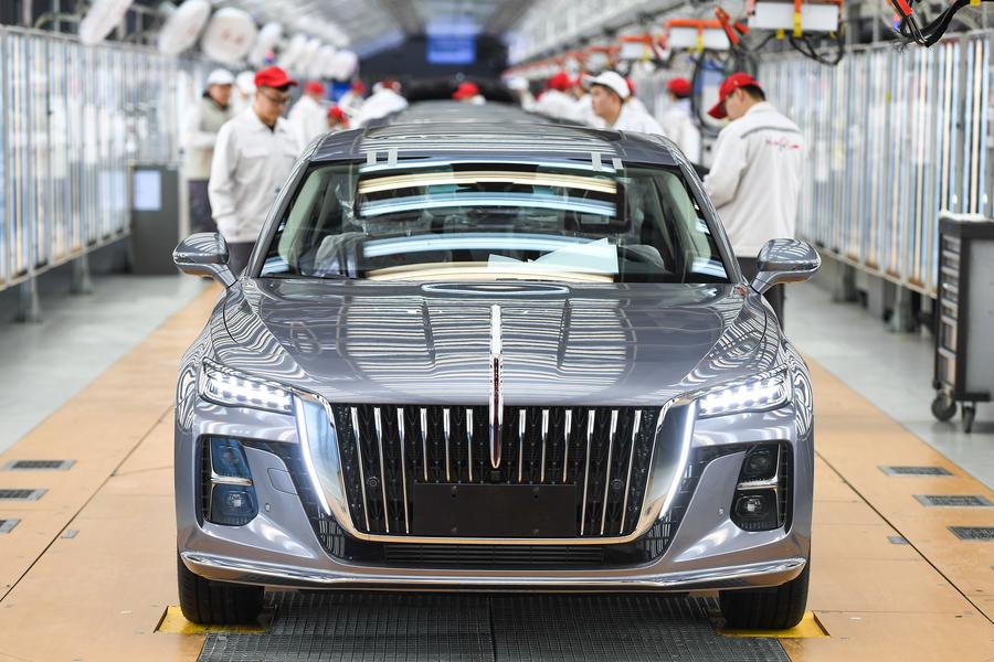 Employees check assembled cars at a workshop of automaker FAW Hongqi in Changchun, northeast China's Jilin Province, Feb. 19, 2024. (Xinhua/Zhang Nan)