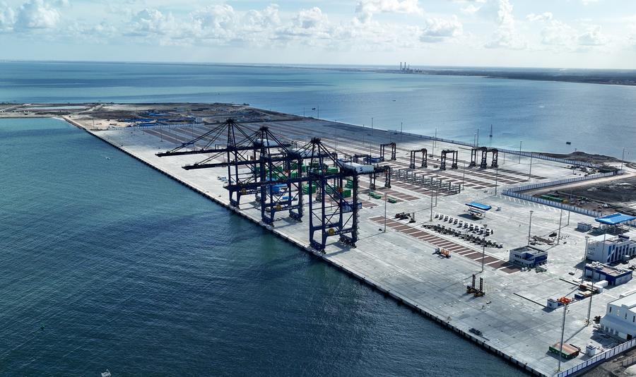 An aerial drone photo taken on Dec. 1, 2023 shows a view of Abu Qir Marine Port Container Terminal in Alexandria, Egypt. The China-constructed Abu Qir Marine Port Container Terminal in the Egyptian coastal city of Alexandria has started operation. (CHEC/Handout via Xinhua)
