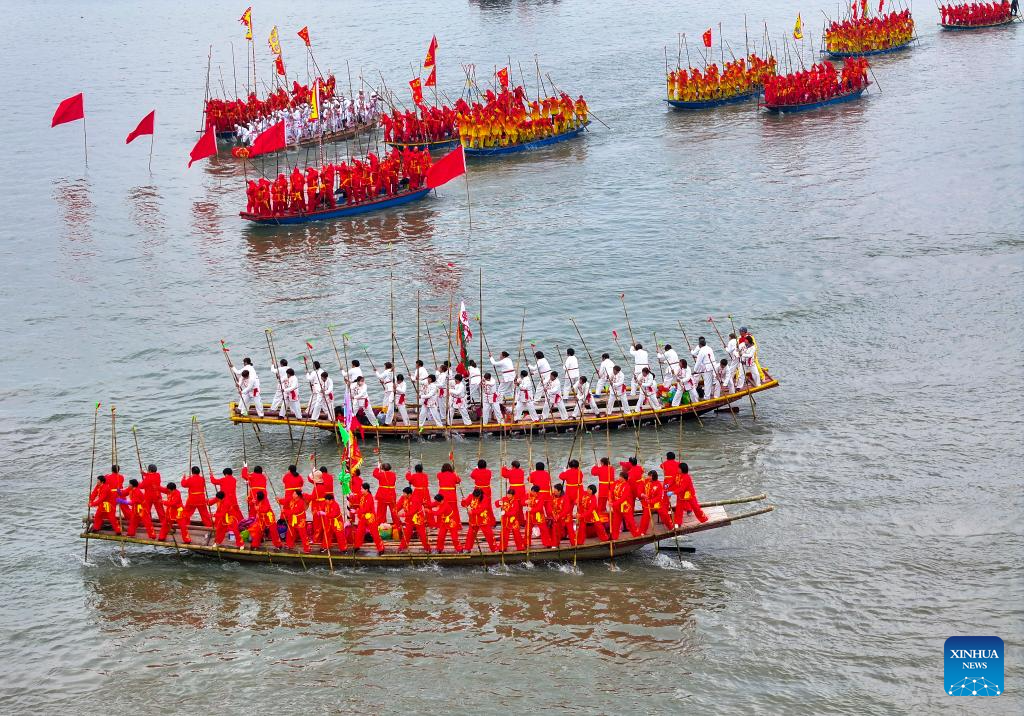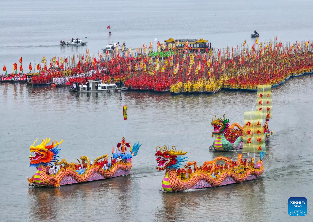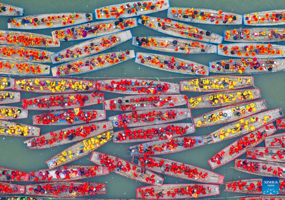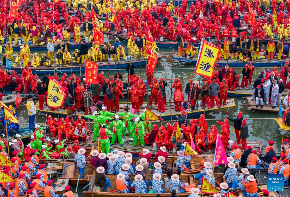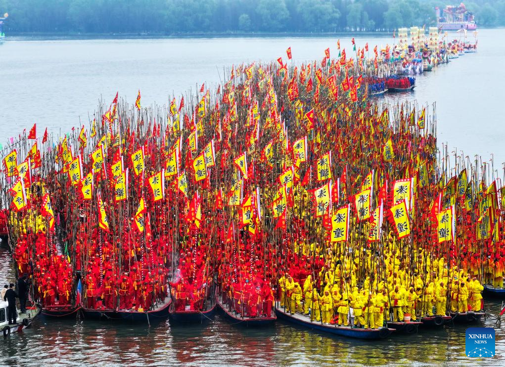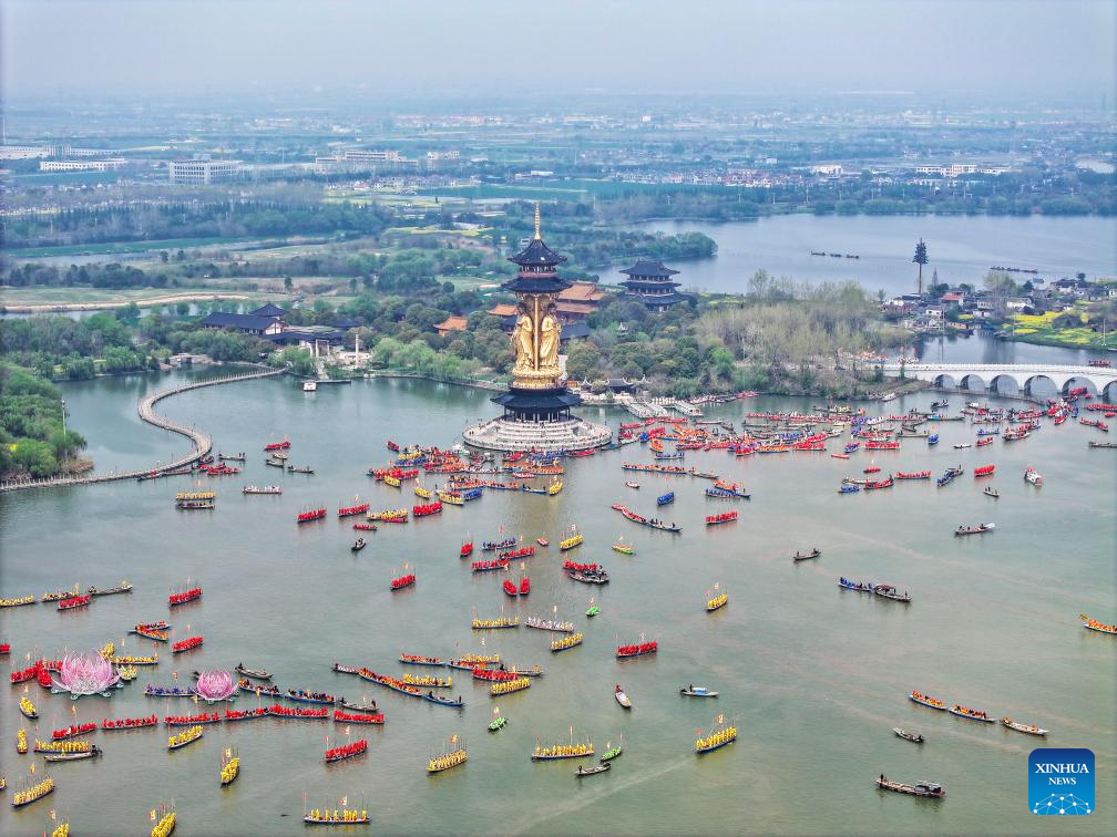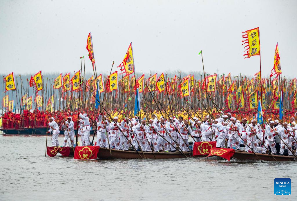 People participate in a boat performance during the 2024 Qintong Boat Festival held at Qinhu National Wetland Park in Jiangyan District of Taizhou, east China's Jiangsu Province, April 6, 2024. Hundreds of boats with more than 10,000 boat team members aboard gathered here on Saturday for the Qintong Boat Festival, which has been a centuries-old tradition. (Photo by Tang Dehong/Xinhua)