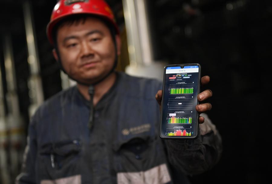 A worker shows a mobile phone screen that displays real-time data collected from coalface area of the Daliuta Coal Mine operated by the Shendong Coal Group Co., Ltd. in northwest China's Shaanxi Province, Nov. 30, 2023. (Xinhua/Li Yibo)