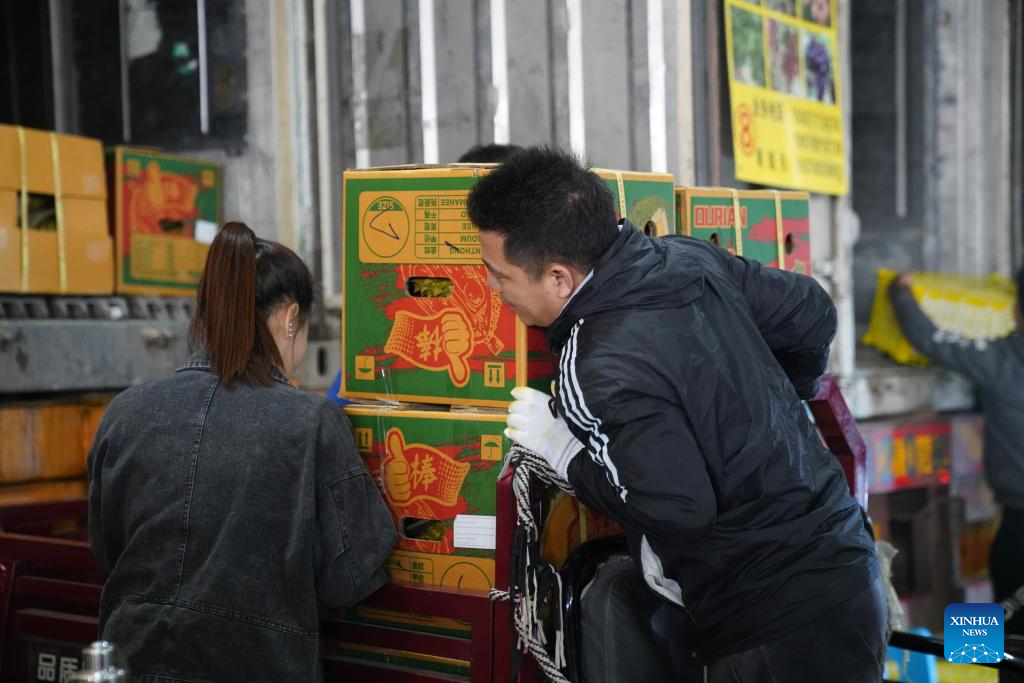 Vendors transport packaged durians at Haijixing Market, a large wholesale fruit market, in Nanning, south China's Guangxi Zhuang Autonomous Region, April 25, 2023. (Xinhua/Zhao Huan)
