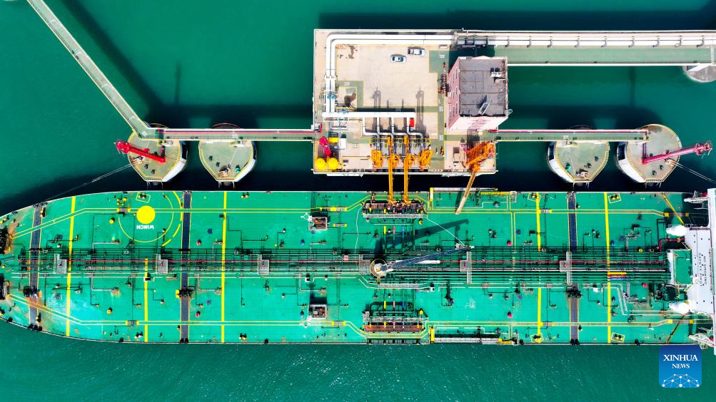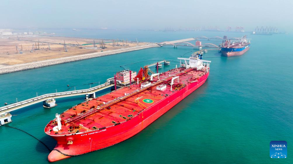 An aerial drone photo taken on March 29, 2024 shows a vessel offloading fuel at an oil terminal of Lanshan Area of Rizhao Port in Rizhao, east China's Shandong Province. The cargo throughput of Rizhao Port saw year-on-year growth of 6.7 percent in the first quarter of this year, among which container throughput hiked by 15.3 percent year-on-year. (Xinhua/Guo Xulei)