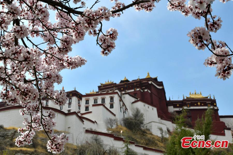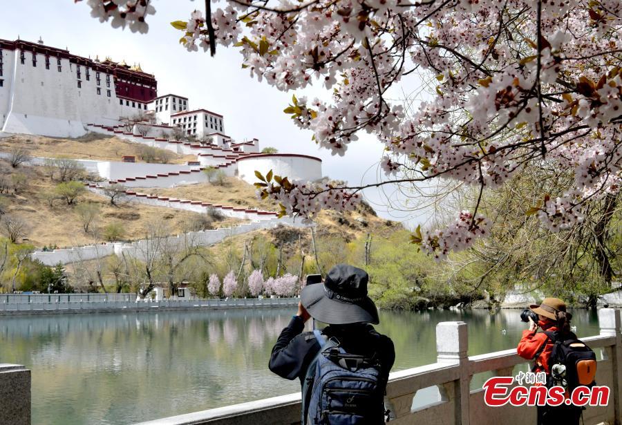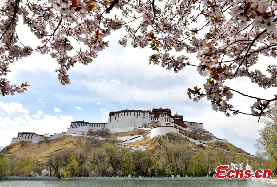 Potala Palace is surrounded by blooming flowers in Lhasa, Southwest China's Xizang Autonomous Region, April 6, 2024. (Photo: China News Service/Li Lin)