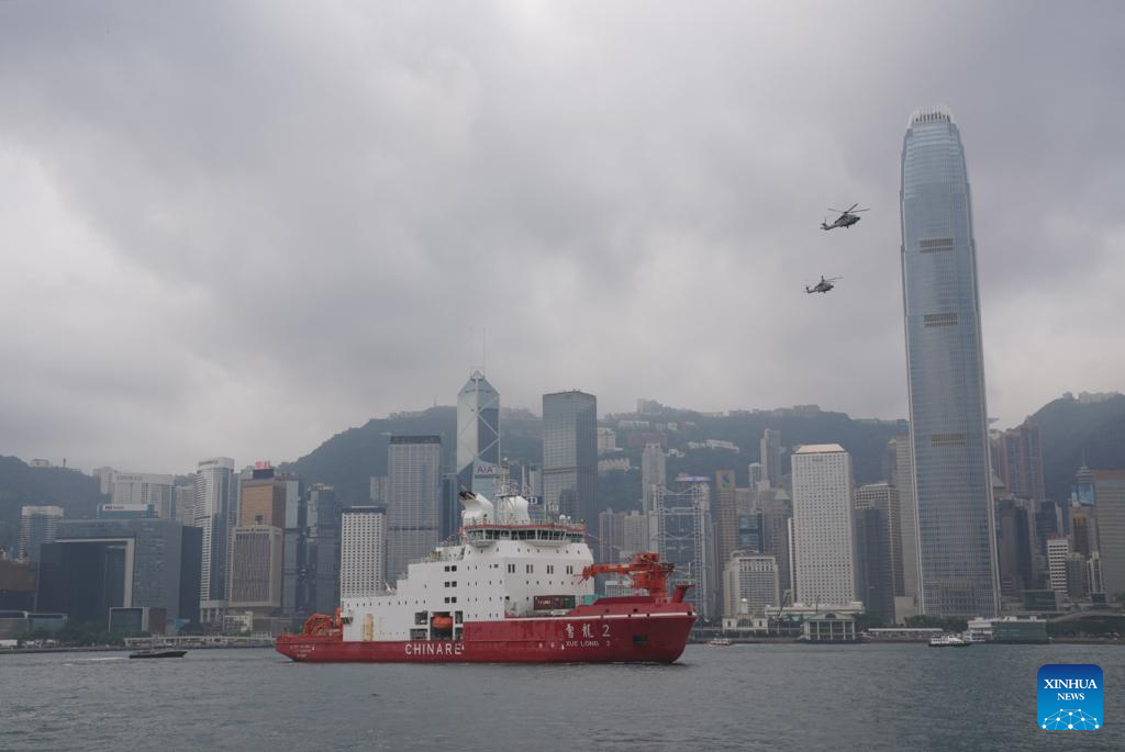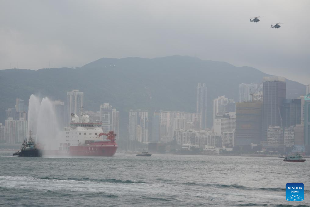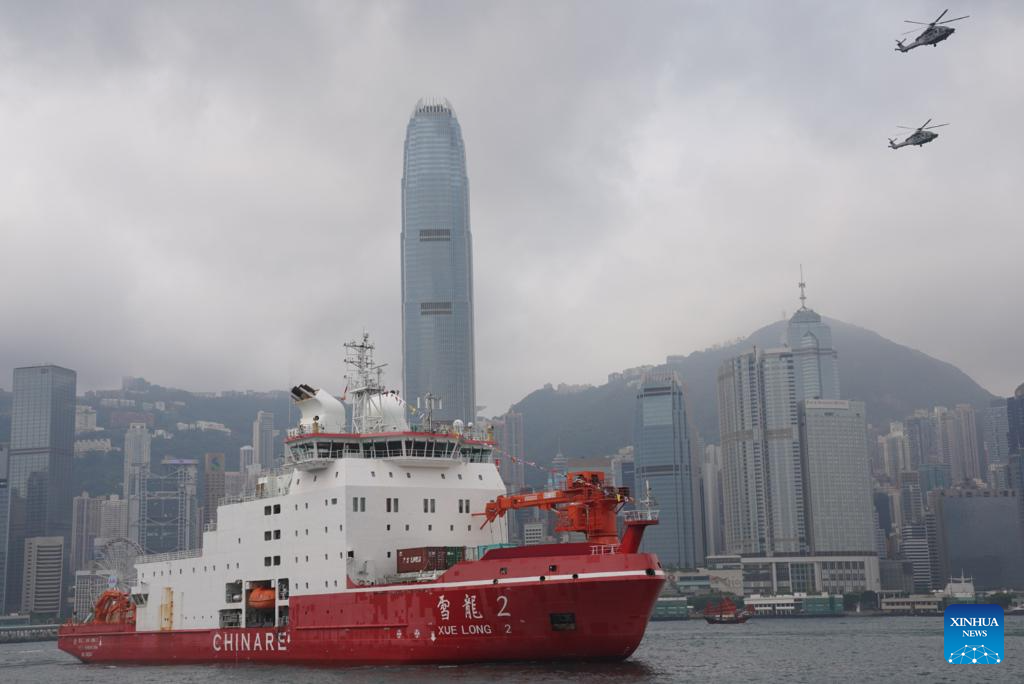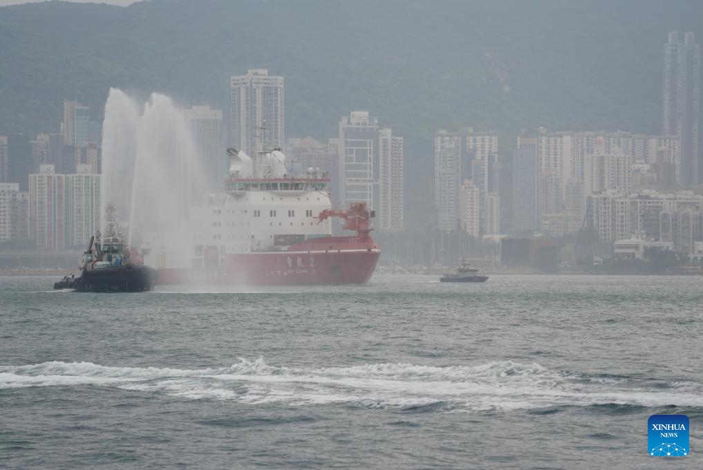 China's polar icebreaker Xuelong 2, or Snow Dragon 2, enters the Ocean Terminal in Tsim Sha Tsui, Hong Kong, south China, April 8, 2024. China's first domestically made polar icebreaker Xuelong 2, or Snow Dragon 2, arrived in Hong Kong for the very first time on Monday for a five-day visit. (Xinhua/Lui Siu Wai)