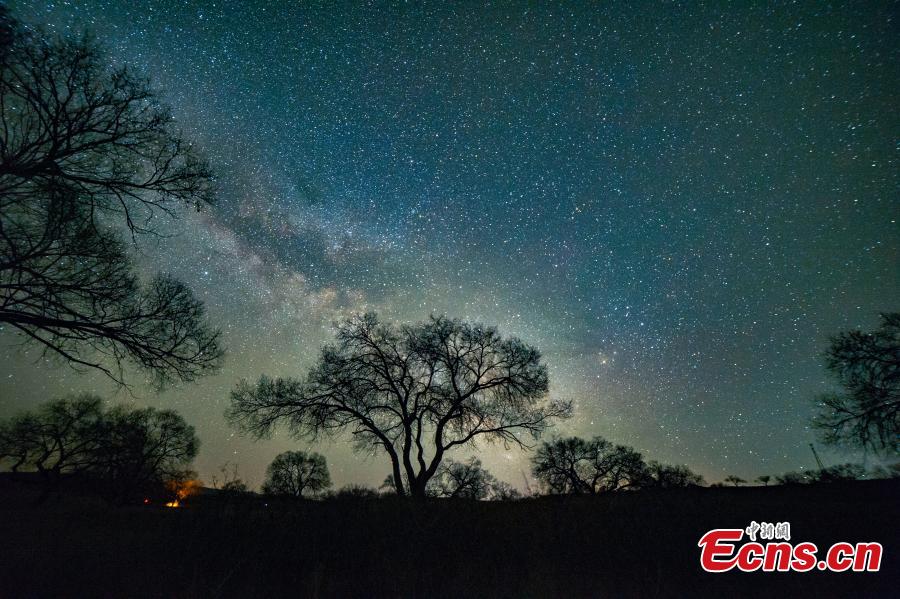 Night view of trees against the starry night with the Milky Way galaxy over a sand field in Xilingol League, north China's Inner Mongolia Autonomous Region. (Photo: China News Service/Guan Yongxin)