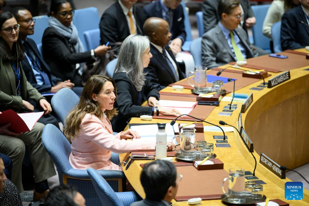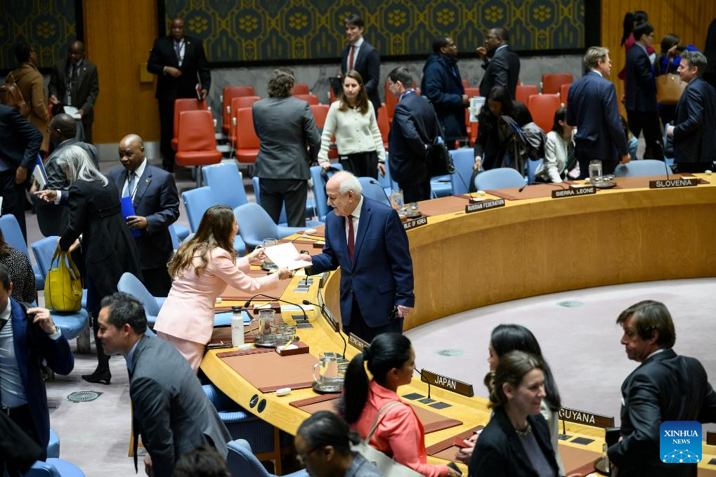The UN Security Council holds a meeting to renew consideration of Palestine's full UN membership at the UN Headquarters in New York, on April 8, 2024. The UN Security Council on Monday renewed consideration of Palestine's full UN membership application and decided to refer the matter to its Committee on the Admission of New Members. (Loey Felipe/UN Photo/Handout via Xinhua)