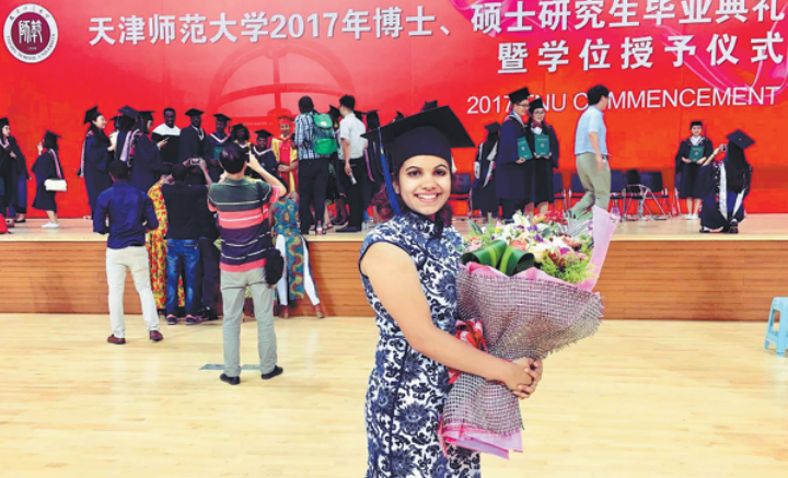 Shikha Pandey attends her graduation ceremony at Tianjin Normal University in 2017. CHINA DAILY