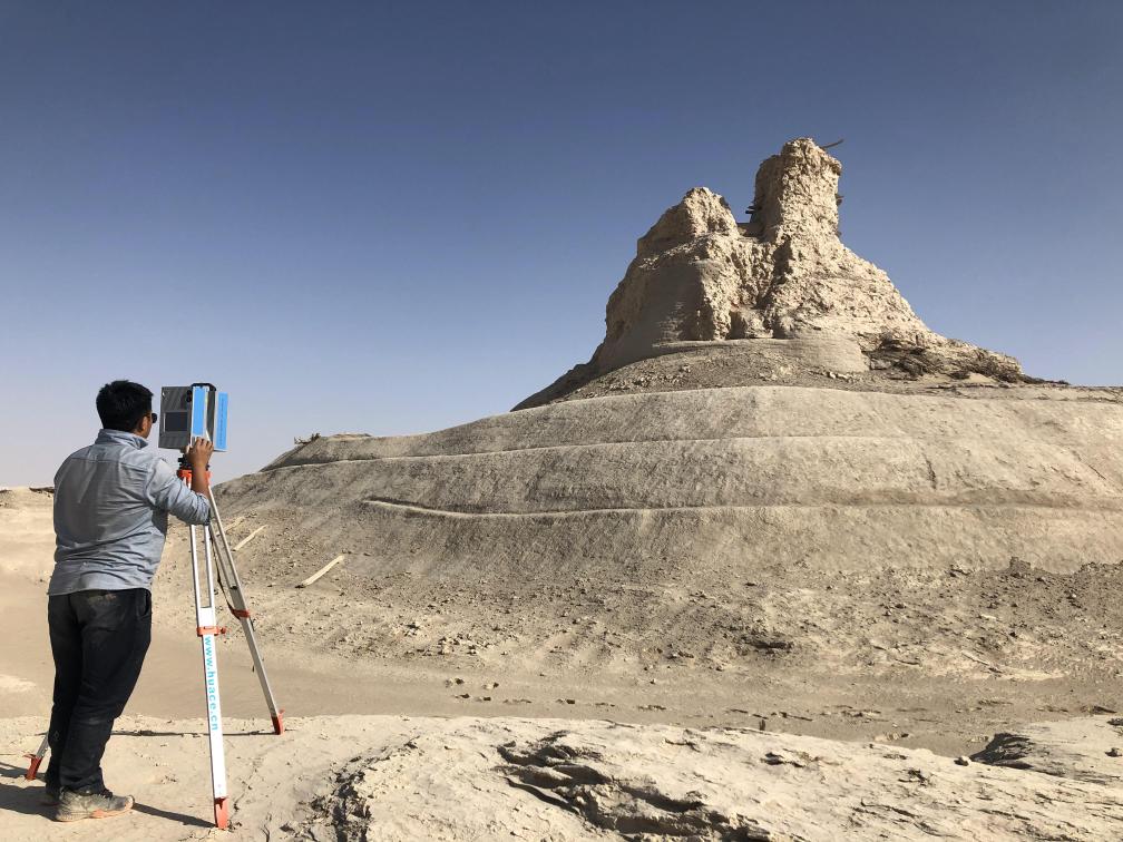 This file photo taken on Oct. 20, 2020 shows a member of cultural relics protection staff creating digital file with a 3-D laser scanner for the ruins of a stupa at the Loulan Ruins in the wilderness of Ruoqiang County, northwest China's Xinjiang Uygur Autonomous Region. (Northwest Research Institute Co., Ltd. of CREC/Handout via Xinhua)
