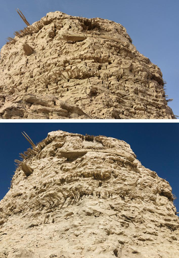 In this combo photo, the upper half taken on Nov. 14, 2019 shows part of the ruins of a stupa before a reinforcement project at the Loulan Ruins in the wilderness of Ruoqiang County, northwest China's Xinjiang Uygur Autonomous Region and the lower half taken on Oct. 20, 2020 shows the same part of the stupa after the reinforcement project. (Northwest Research Institute Co., Ltd. of CREC/Handout via Xinhua)