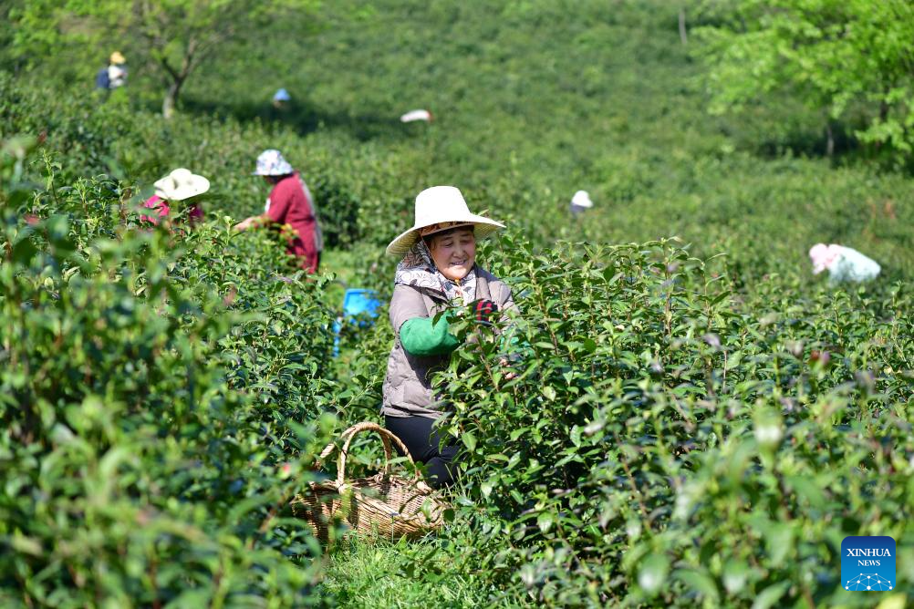 Farmers pick tea leaves at a tea garden in Feixi County of Hefei City, east China's Anhui Province, April 9, 2024. As spring unfolds, tea gardens across the region have entered the harvest season. (Photo by Xu Yong/Xinhua)