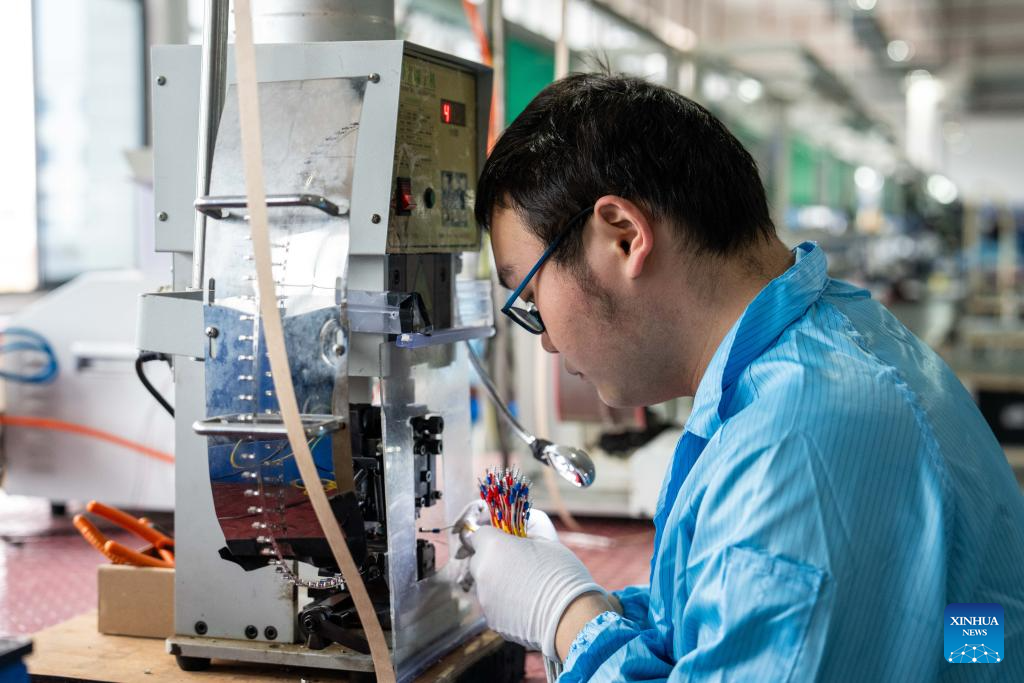 A worker makes electronic firework equipment at Showven, a leading manufacturer and supplier of high-end stage special effects products and solutions, in Liuyang City, central China's Hunan Province, April 9, 2024. (Xinhua/Chen Sihan)