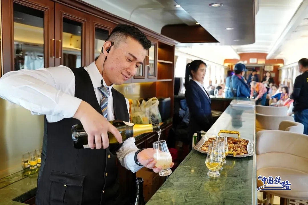 The dining car of the train offers a gourmet experience with delicacies incorporating local specialties created by chefs. Visitors can also enjoy private dining room services, with each meal consisting of eight dishes and one soup, accompanied by beer, wine, and champagne.