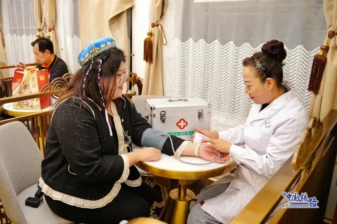 A doctor offers medical services to a passenger onboard a New Orient Express tourist-dedicated train. (Photo from the media convergence center of China Railway Urumqi Bureau Group Co., Ltd.)
