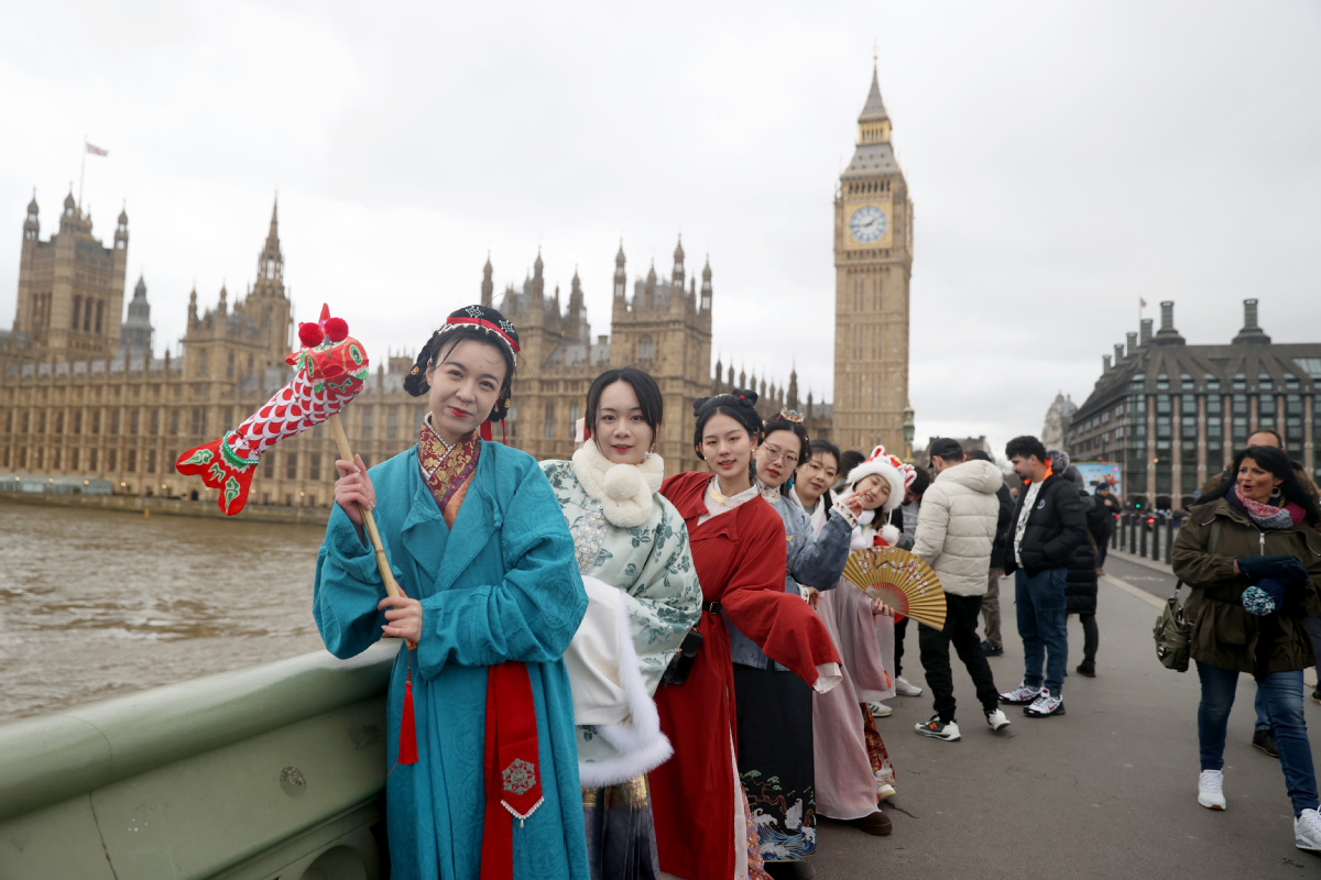 Hanfu enthusiasts display hanfu in front of Big Ben in London in February. LI YING/XINHUA