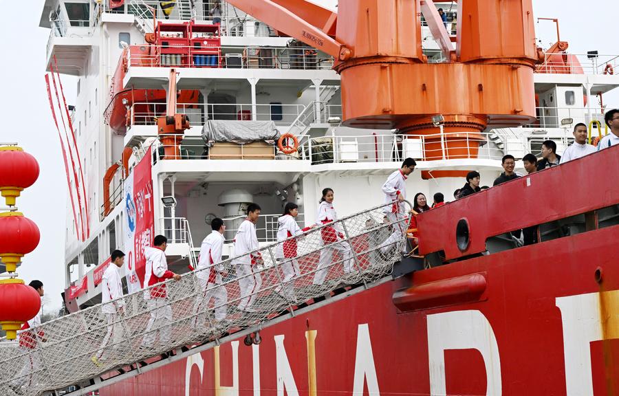 People visit the icebreaker Xuelong at a port in Qingdao, east China's Shandong Province, April 10, 2024. (Xinhua/Li Ziheng)