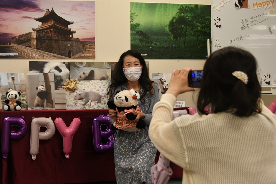 A woman poses for photos at a birthday party of giant panda Xiang Xiang in Tokyo, Japan, June 12, 2023. (Xinhua/Yue Chenxing)