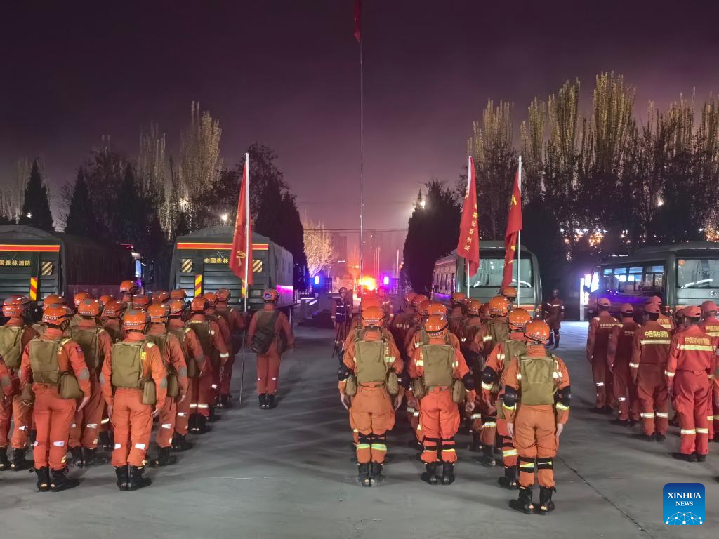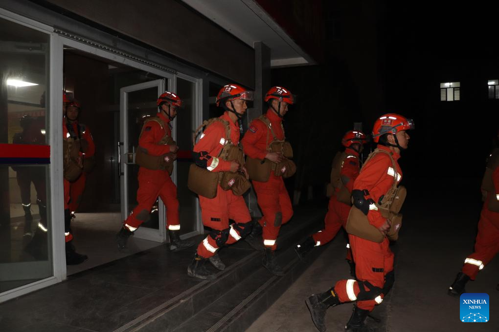 Members of the Xinjiang forest fire brigade rally for rescue operations in the earthquake-jolted area in northwest China's Xinjiang Uygur Autonomous Region, April 10, 2024. A 5.6-magnitude earthquake jolted Baicheng County in northwest China's Xinjiang Uygur Autonomous Region at 10:56 p.m. Wednesday (Beijing Time), according to the China Earthquake Networks Center (CENC). (Photo by Wang Xudong/Xinhua)
