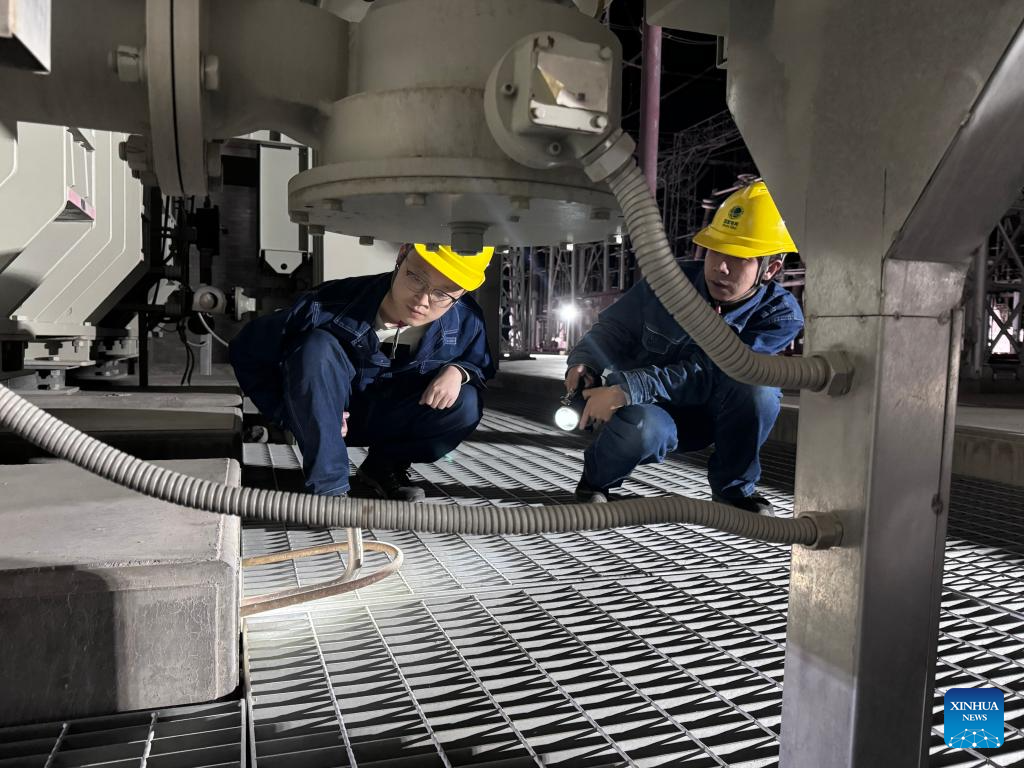 Staff members conduct a post-earthquake patrol at a 750-kV substation in Kuche, northwest China's Xinjiang Uygur Autonomous Region, April 10, 2024. A 5.6-magnitude earthquake jolted Baicheng County in northwest China's Xinjiang Uygur Autonomous Region at 10:56 p.m. Wednesday (Beijing Time), according to the China Earthquake Networks Center (CENC). (Photo by Zhang Zhenjiang/Xinhua)