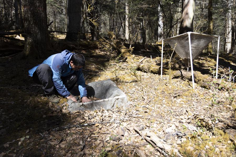 Fan Zhongyu checks an equipment for collecting seeds at a sample area in Lijiang Alpine Botanic Garden in Lijiang, southwest China's Yunnan Province, March 28, 2024. (Xinhua/Jin Liwang)