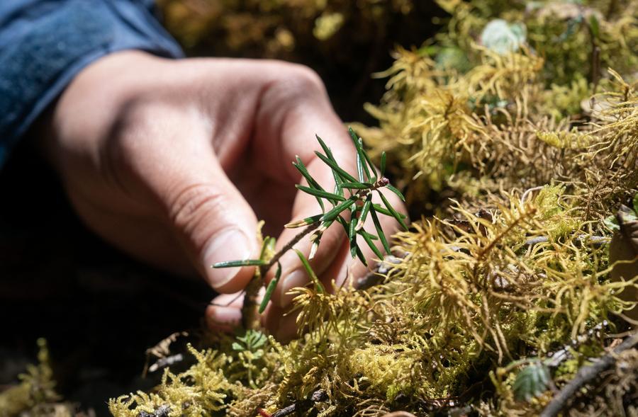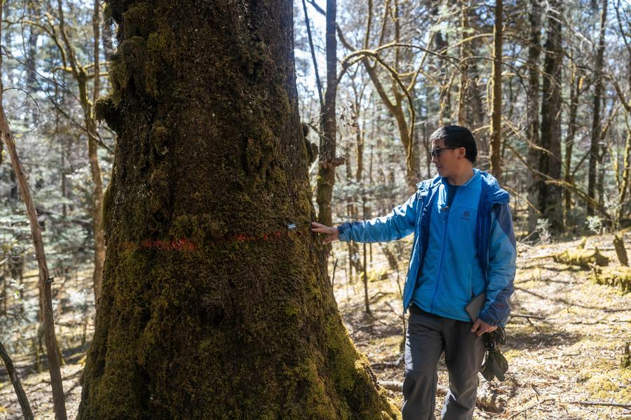 Fan Zhongyu observes a fir at a sample area in Lijiang Alpine Botanic Garden in Lijiang, southwest China's Yunnan Province, March 28, 2024. (Xinhua/Chen Xinbo)