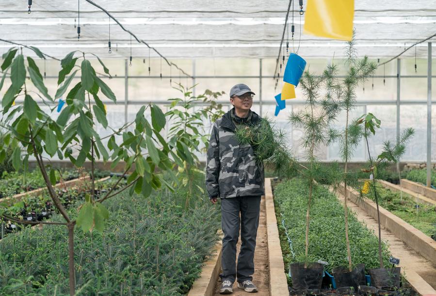 Xu Kun checks the growth of plants in a greenhouse at the Lijiang Alpine Botanic Garden in Lijiang, southwest China's Yunnan Province, March 27, 2024. (Xinhua/Chen Xinbo)