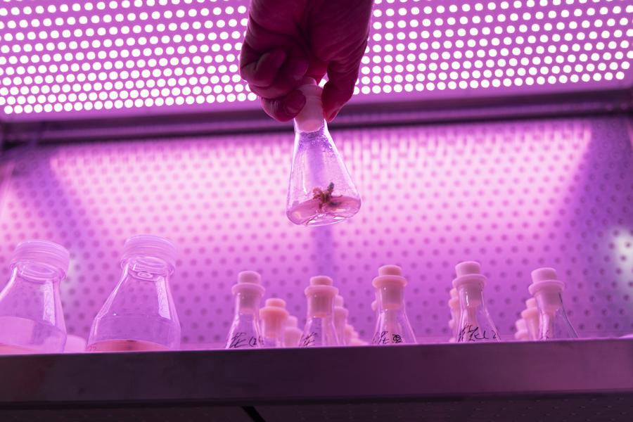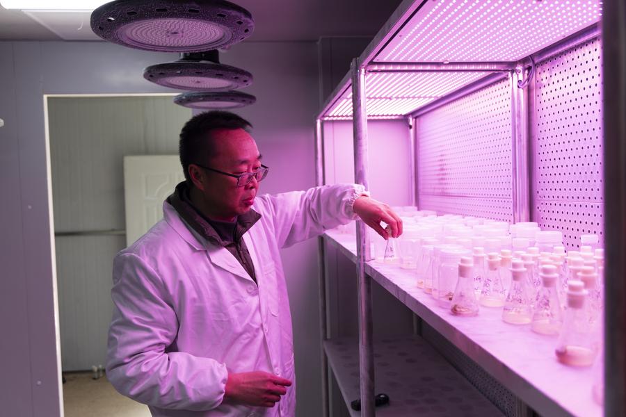 Xu Kun checks the germination of the seeds of Cypripedium flavum at the Lijiang Alpine Botanic Garden in Lijiang, southwest China's Yunnan Province, March 27, 2024. (Xinhua/Jin Liwang)