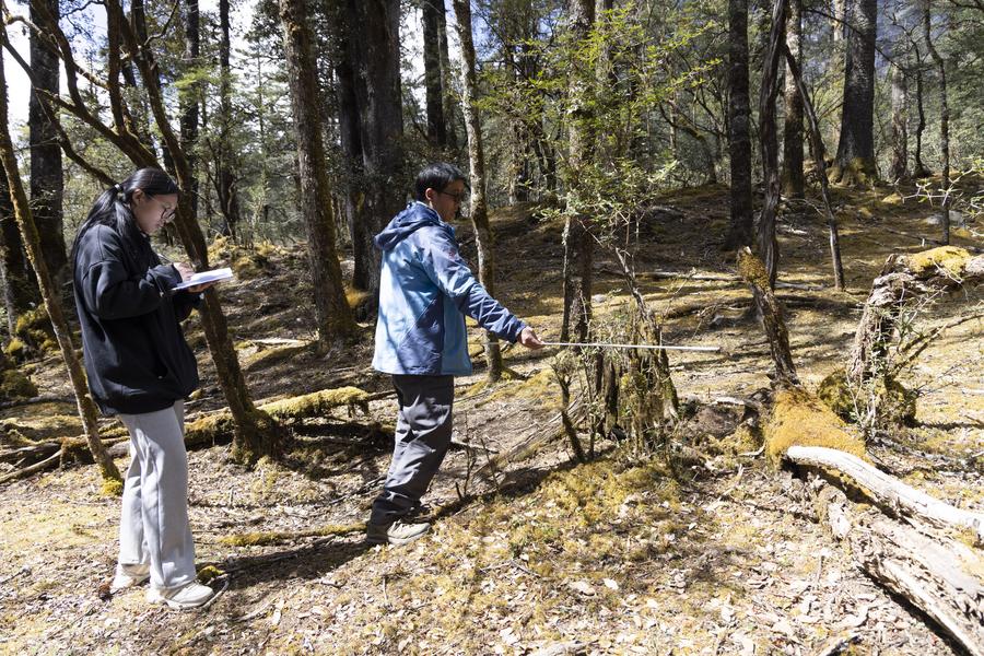 Fan Zhongyu (R) collects statistics at a sample area in Lijiang Alpine Botanic Garden in Lijiang, southwest China's Yunnan Province, March 28, 2024. (Xinhua/Jin Liwang)