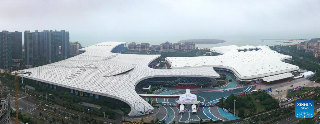 This aerial drone photo taken on April 11, 2024 shows the Hainan International Convention and Exhibition Center, the main venue for the upcoming fourth China International Consumer Products Expo, in Haikou, south China's Hainan Province. The event will open on Saturday in Haikou, the capital city of south China's Hainan Province. (Xinhua/Guo Cheng)