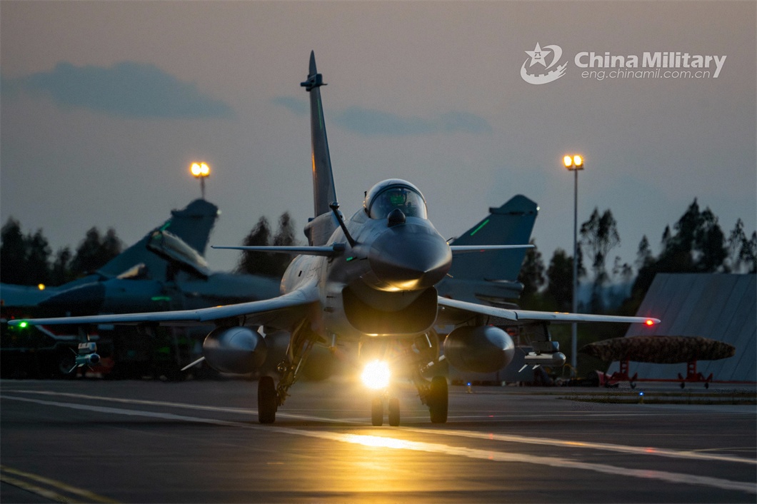 A J-10 attached to an aviation brigade with the air force under PLA Southern Theater Command taxies on the runway during a round-the-clock flight training exercise on March 26, 2023. (eng.chinamil.com.cn/Photo by Shang Jieyan)