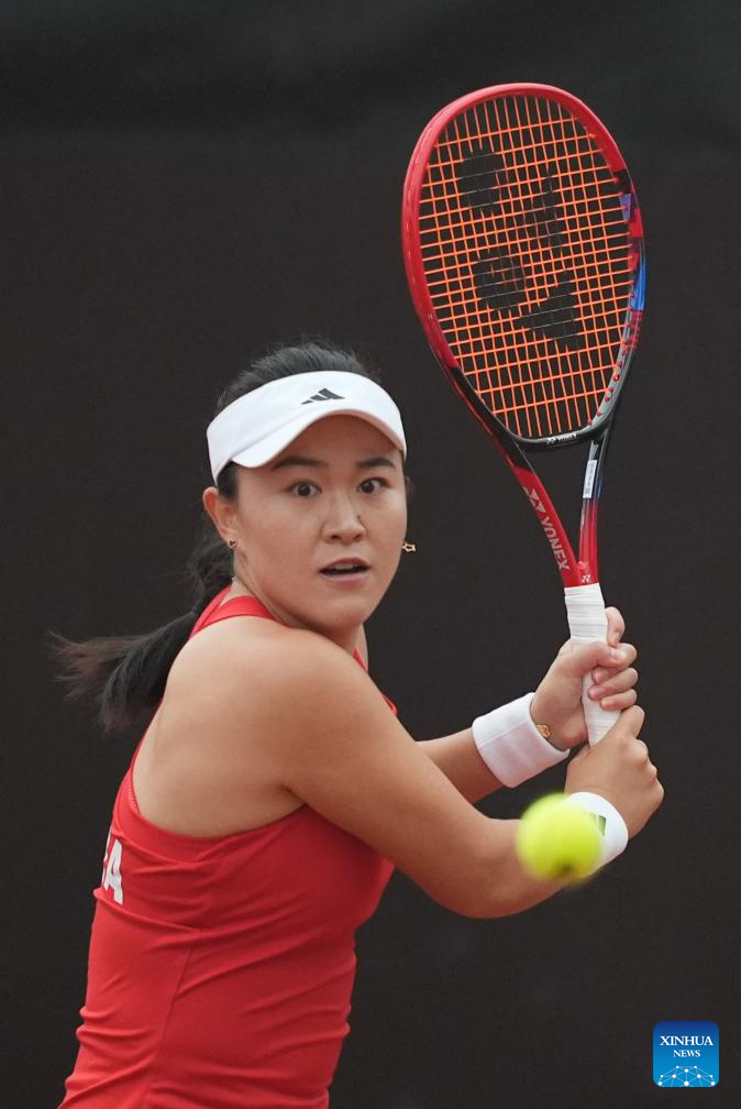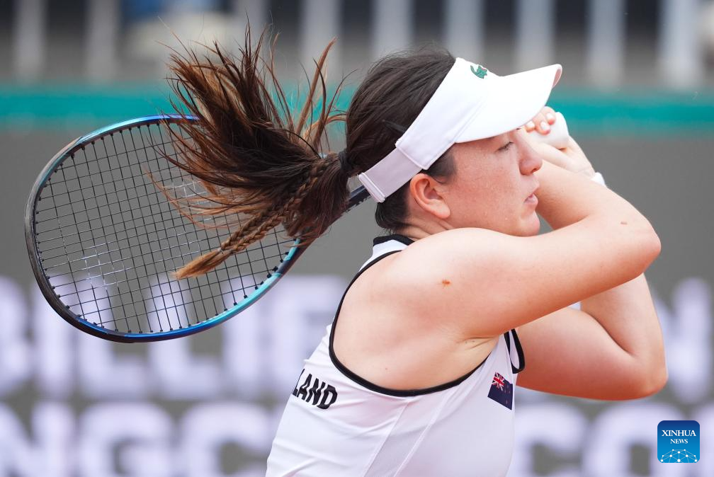 Sun Lulu of New Zealand returns the ball during the women's singles match against Wang Xiyu of China during the women's singles match against Wang Xiyu of China at the Billie Jean King Cup 2024 tennis tournament Asia-Oceania Group I match in Changsha, central China's Hunan Province, April 11, 2024 (Xinhua/Xue Yuge)