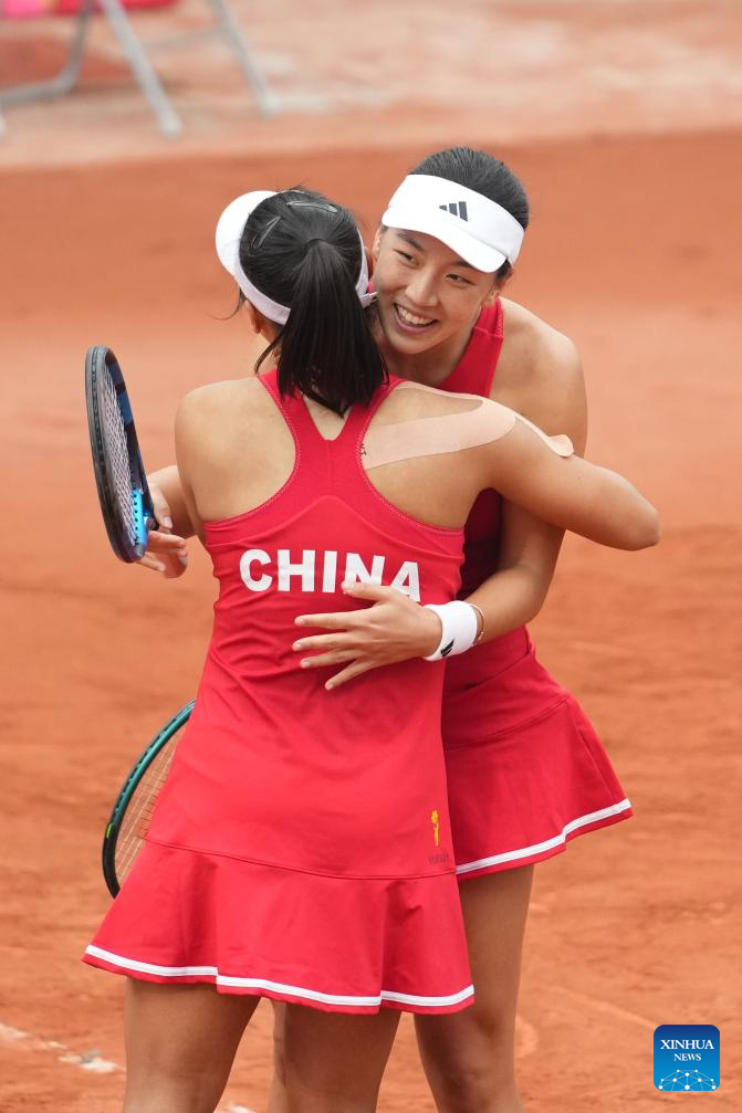 Wang Xinyu (R)/Guo Hanyu of China celebrate after the women's doubles match against Erin Routliffe/Sun Lulu of New Zealand at the Billie Jean King Cup 2024 tennis tournament Asia-Oceania Group I match in Changsha, central China's Hunan Province, April 11, 2024. (Xinhua/Xue Yuge)