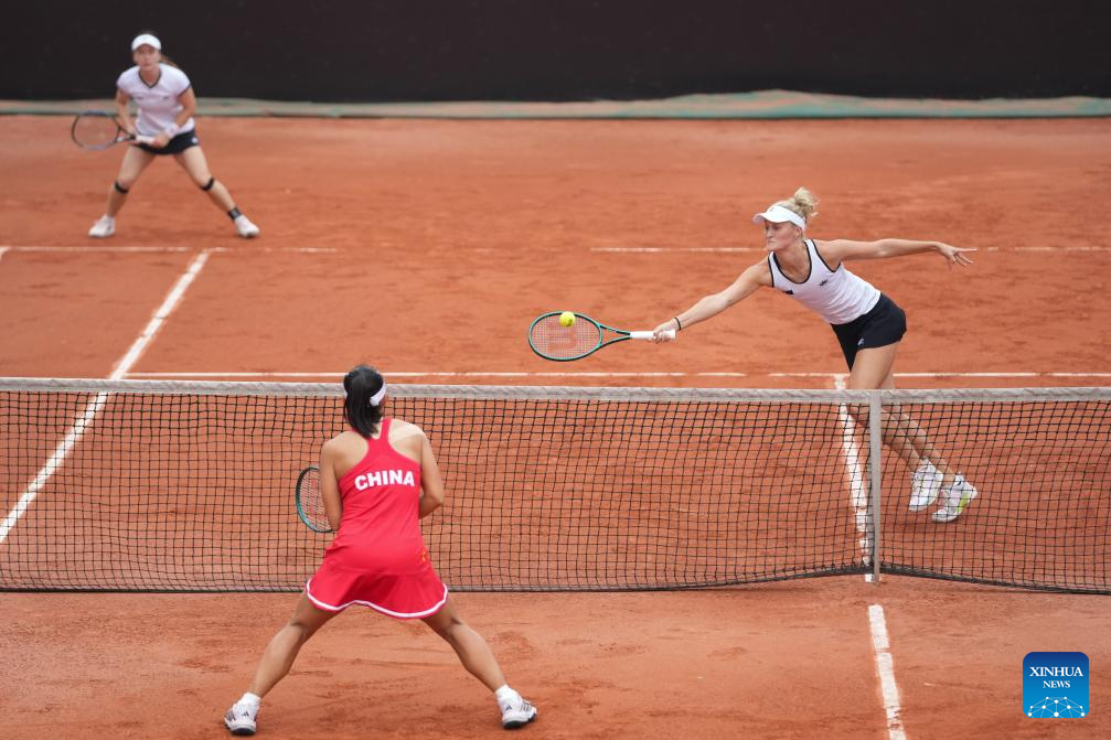 Erin Routliffe (R)/Sun Lulu of New Zealand return the ball during the women's doubles match against Wang Xiyu/Guo Hanyu of China at the Billie Jean King Cup 2024 tennis tournament Asia-Oceania Group I match in Changsha, central China's Hunan Province, April 11, 2024. (Xinhua/Xue Yuge)
