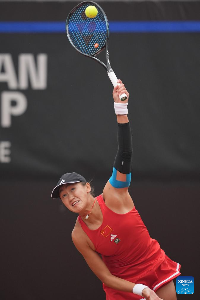 Wang Xiyu of China serves the ball during the women's singles match against Sun Lulu of New Zealand during the women's singles match against Sun Lulu of New Zealand at the Billie Jean King Cup 2024 tennis tournament Asia-Oceania Group I match in Changsha, central China's Hunan Province, April 11, 2024 (Xinhua/Xue Yuge)