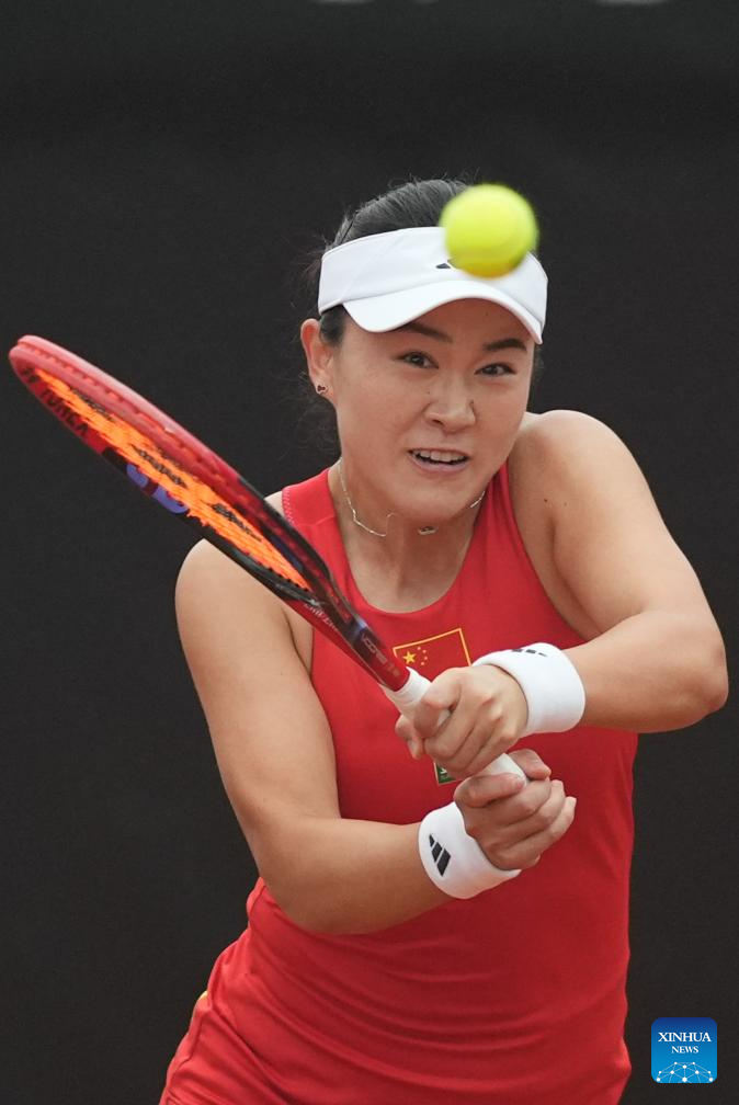 Zhu Lin of China returns the ball during the women's singles match against Valentina Ivanov of New Zealand at the Billie Jean King Cup 2024 tennis tournament Asia-Oceania Group I match in Changsha, central China's Hunan Province, April 11, 2024. (Xinhua/Xue Yuge)