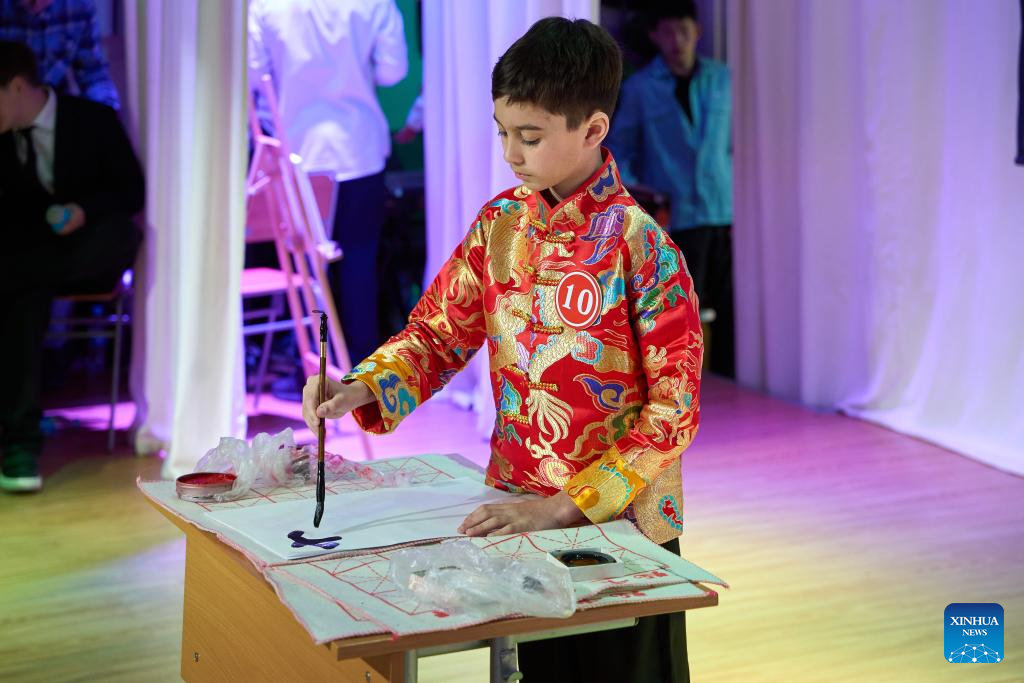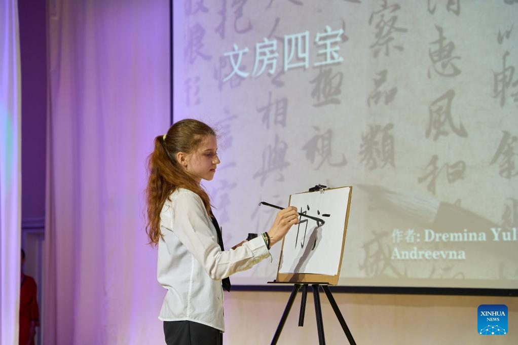 A secondary school student demonstrates Chinese calligraphy during the 2024 "Chinese Bridge" Chinese proficiency competition for primary and secondary school students in Vladivostok, Russia, April 9, 2024. The competition was held here on Tuesday. (Photo by Guo Feizhou/Xinhua)
