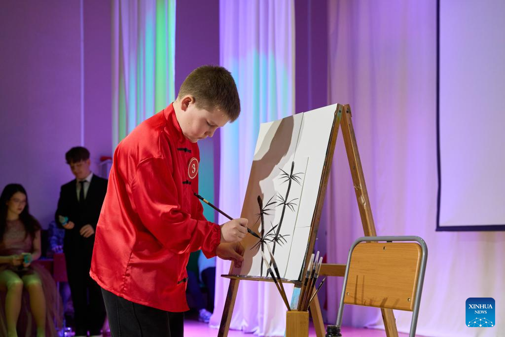 A secondary school student demonstrates painting with a writing brush during the 2024 "Chinese Bridge" Chinese proficiency competition for primary and secondary school students in Vladivostok, Russia, April 9, 2024. The competition was held here on Tuesday. (Photo by Guo Feizhou/Xinhua)